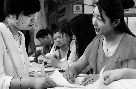 這也表現(xiàn)在當(dāng)天的招聘活動(dòng)上。在當(dāng)天活動(dòng)的鄭州主會(huì)場,即將大專畢業(yè)的朱康想找一份圖文設(shè)計(jì)的工作,這和她的專業(yè)對(duì)口?!巴﹄y找的,好多是話務(wù)員、銷售、傳菜員之類的技能性不高的工作。放棄專業(yè)去做其他的,感覺沒有優(yōu)勢,未來發(fā)展空間也不大?!敝炜嫡f。