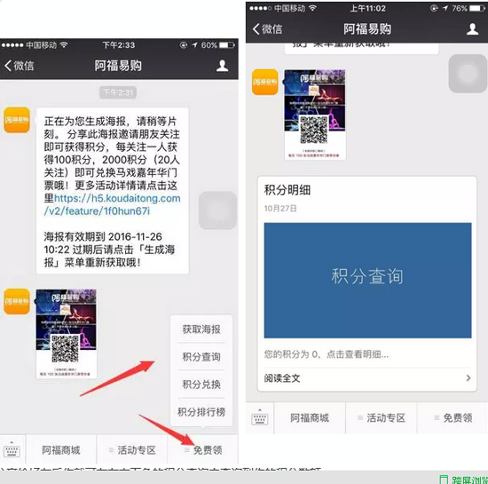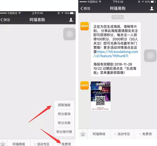 首先點擊右小角的免費領,然后點擊分享海報,分享給好友關注阿福易購的微信公號就可獲得積分。一個好友一百個積分,20個好友就可獲得2千個積分就能兌換馬戲門票。