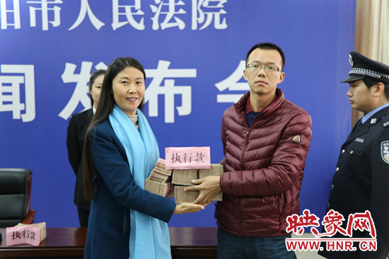在發(fā)布會(huì)現(xiàn)場(chǎng),全國人大代表、鄭州海龍集團(tuán)董事長徐曉同志為兩起典型案件當(dāng)事人家屬現(xiàn)場(chǎng)發(fā)放執(zhí)行款。