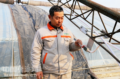 王莊鎮(zhèn)農(nóng)民陳學(xué)文在查看自動化大棚卷簾機