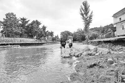 新縣卡房鄉(xiāng)因橋被洪水沖斷,群眾只能涉水過河。記者何正權(quán)李鑫攝影