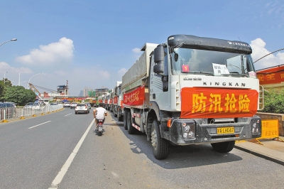 昨天,武漢市江漢區(qū)沿江大道,一排排渣土車滿載渣土,??吭诼愤叀iL江北岸的堤壩上,到處張貼著“人在堤在”、“誓死保衛(wèi)大武漢”等宣傳標(biāo)語。