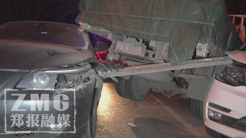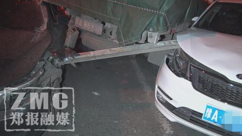 鄭報融媒記者看到,肇事寶馬車為懸掛豫A號牌的灰色5系轎車,該車車頭左側(cè)撞擊卡車后保險杠后受損嚴(yán)重,受傷部位由車身延伸至駕駛艙,鐵質(zhì)車身被劃開一道約20厘米寬的口子,駕駛位上方車頂部位則卡在了卡車車尾之下。