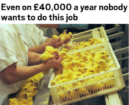 小雞性別鑒定師! 大概一天要看800-1200只小雞的屁屁鑒定他們的性別。。。 年薪4萬英鎊。。。 英國現(xiàn)在都沒人愿意去做這個。。也許一天還好。。。你能忍受成年累月的看雞屁屁么-。-?