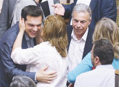 11日,希臘議會(huì)通過(guò)旨在解決債務(wù)問(wèn)題的新協(xié)議草案,議員擁抱總理齊普拉斯表示祝賀。