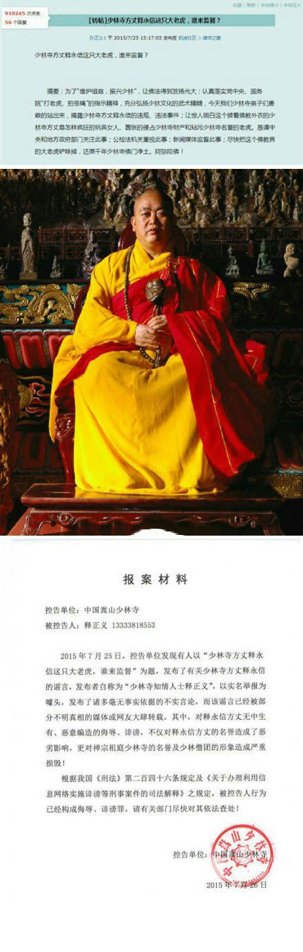 近日,一位自稱“少林寺知情人士釋正義”的人在網(wǎng)上發(fā)布“少林寺方丈釋永信這只大老虎,誰來監(jiān)督”的帖子,對此,中國嵩山少林寺官方網(wǎng)站發(fā)布報案材料,要求“有關(guān)部門盡快對造謠者依法進(jìn)行查處”。
