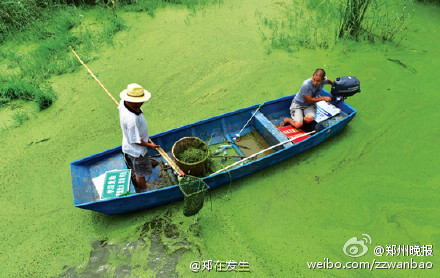 13、鄭州西流湖漂滿浮萍變“草地” 一夜間魚幾乎死光