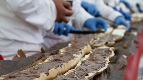 之后,面包師將長(zhǎng)棍兒切成過百段,涂上榛子巧克力醬,送給在場(chǎng)見證的觀眾分享。