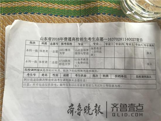 陜西師范大學(xué)在山東招收6名體育教育專業(yè)的學(xué)生,均為免費師范生。第一志愿的錄取線為文化課362分,專業(yè)課66.54分。學(xué)校按照專業(yè)課成績由高到低擇優(yōu)錄取。常升的文化課考了403分,專業(yè)課考了93.64分,遠超出學(xué)校的錄取線。而魯東大學(xué)官網(wǎng)顯示,該校社會體育指導(dǎo)與管理專業(yè)的文化課最低錄取分數(shù)為407分,而常升的文化課成績差4分。不過,該校對專業(yè)課要求低,專業(yè)課成績最高分僅為77.65分。