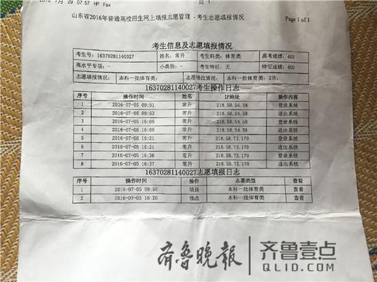 后來,他們從青島市招生辦網(wǎng)上填報志愿系統(tǒng)了解到,7月5日上午10點左右報完志愿后,下午4點20分,常升的志愿被修改,一志愿被改為了魯東大學(xué)社會體育指導(dǎo)與管理專業(yè)。