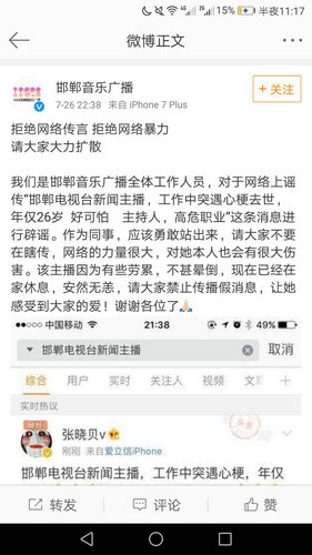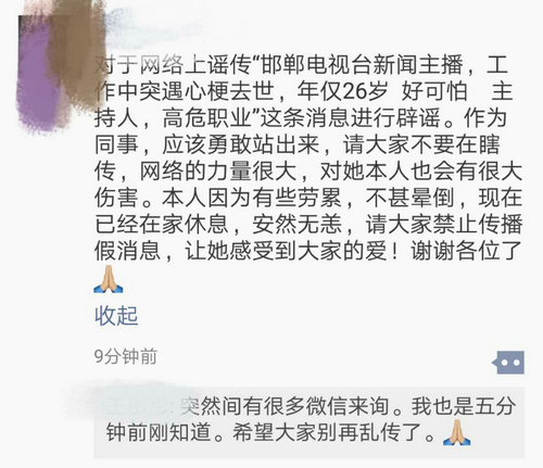 微博上暈倒的女主播為《邯鄲新聞》主播,在主持當?shù)匾豁棸l(fā)布活動時因勞累而暈倒在地,并被網(wǎng)友拍了視頻發(fā)在網(wǎng)上,稱其猝死。為此,彤彤特意發(fā)了一條朋友圈來辟謠,提醒大家不要傳謠以免給本人造成傷害。
