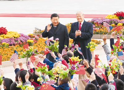 11月9日,國家主席習(xí)近平在北京人民大會堂東門外廣場舉行歡迎儀式,歡迎美利堅合眾國總統(tǒng)唐納德·特朗普對中國進(jìn)行國事訪問。
