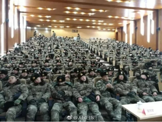 這張照片攝于南京建鄴區(qū)文化藝術(shù)中心小劇場,26日清晨,某舟橋旅官兵540余人,結(jié)束徹夜掃雪除冰任務(wù)后,在此休息。他們中絕大部分是90后、95后。