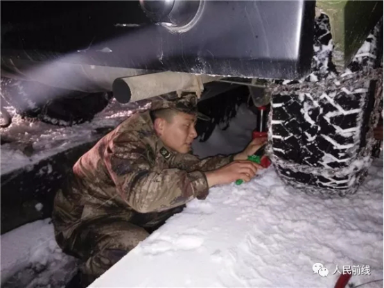 ▲第71集團(tuán)軍某合成旅迅速啟動應(yīng)急方案,檢查并禁錮車輛防滑鏈。