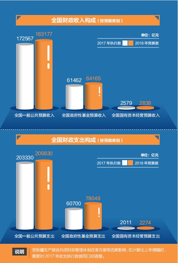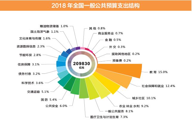 國(guó)家賬本中,最大的賬本就是一般公共預(yù)算。2018年,全國(guó)一般公共預(yù)算收入183177億元,增長(zhǎng)6.1%。加上使用結(jié)轉(zhuǎn)結(jié)余和調(diào)入資金2853億元,收入總量為186030億元。全國(guó)一般公共預(yù)算支出209830億元,扣除上年地方使用結(jié)轉(zhuǎn)結(jié)余及調(diào)入資金后增長(zhǎng)7.6%。