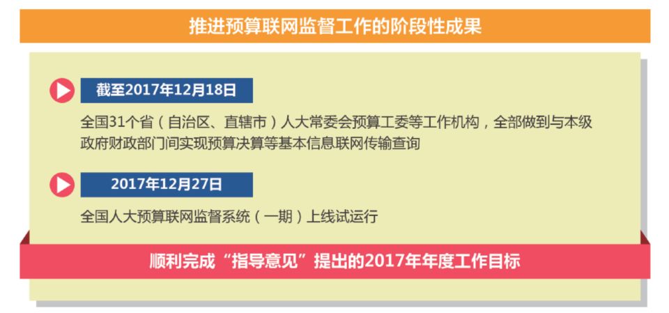 此外,全國(guó)人大還著力推進(jìn)預(yù)算聯(lián)網(wǎng)監(jiān)督工作,更好地打造“陽(yáng)光財(cái)政”。通過(guò)網(wǎng)絡(luò)傳輸報(bào)送、提供聯(lián)網(wǎng)查詢,實(shí)現(xiàn)預(yù)算審查監(jiān)督信息化和網(wǎng)絡(luò)化,提升預(yù)算審查監(jiān)督內(nèi)容的詳實(shí)性和時(shí)效性,增強(qiáng)預(yù)算審查監(jiān)督的針對(duì)性和有效性,推進(jìn)財(cái)政信息公開(kāi)透明和預(yù)算行為規(guī)范有序。目前,推進(jìn)預(yù)算聯(lián)網(wǎng)監(jiān)督工作已經(jīng)取得階段性成果。