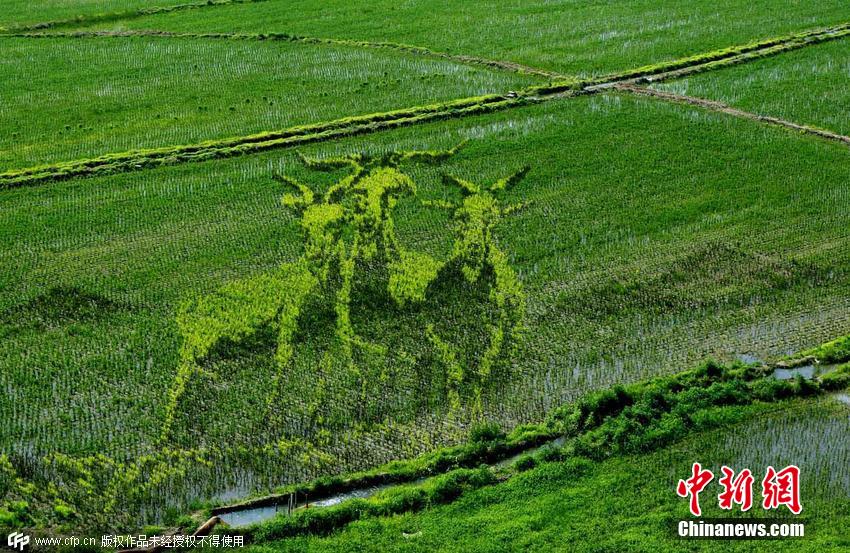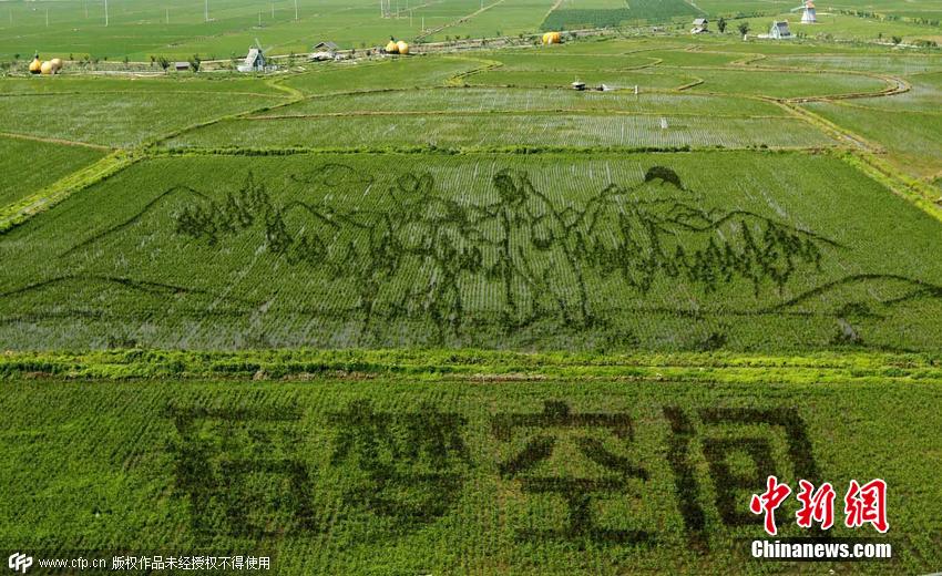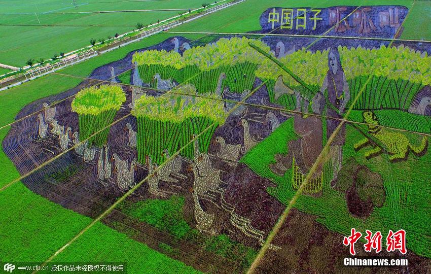 2015年6月22日,遼寧省沈陽市,總占地面積150畝的巨幅稻田畫《中國(guó)日子 呱呱叫》、《中國(guó)夢(mèng) 幸福起航》、《小夢(mèng)露》等十三幅“3D稻田畫”正式亮相沈陽沈北新區(qū)興隆臺(tái)錫伯族鎮(zhèn)。據(jù)了解,錫伯族有種植稻田畫祈福的傳統(tǒng),稻田畫先設(shè)計(jì)好要表現(xiàn)的圖形,利用先進(jìn)的3D技術(shù)和透視技術(shù),用矢量法定點(diǎn)定樁連線人工填色,種植不同品種有著不同顏色葉子的水稻,繪制出平面,立體,嘍空,線條四種不同風(fēng)格稻田畫。田衛(wèi)濤 攝 圖片來源:CFP視覺中國(guó)