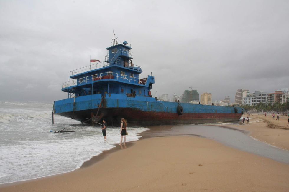 2015年6月23日,海南三亞,“鯨魚(yú)”臺(tái)風(fēng)襲擊海南省萬(wàn)寧市,三亞海面大風(fēng)大浪,2艘大型貨輪和一艘旅游船,被刮到了三亞灣沙灘上。