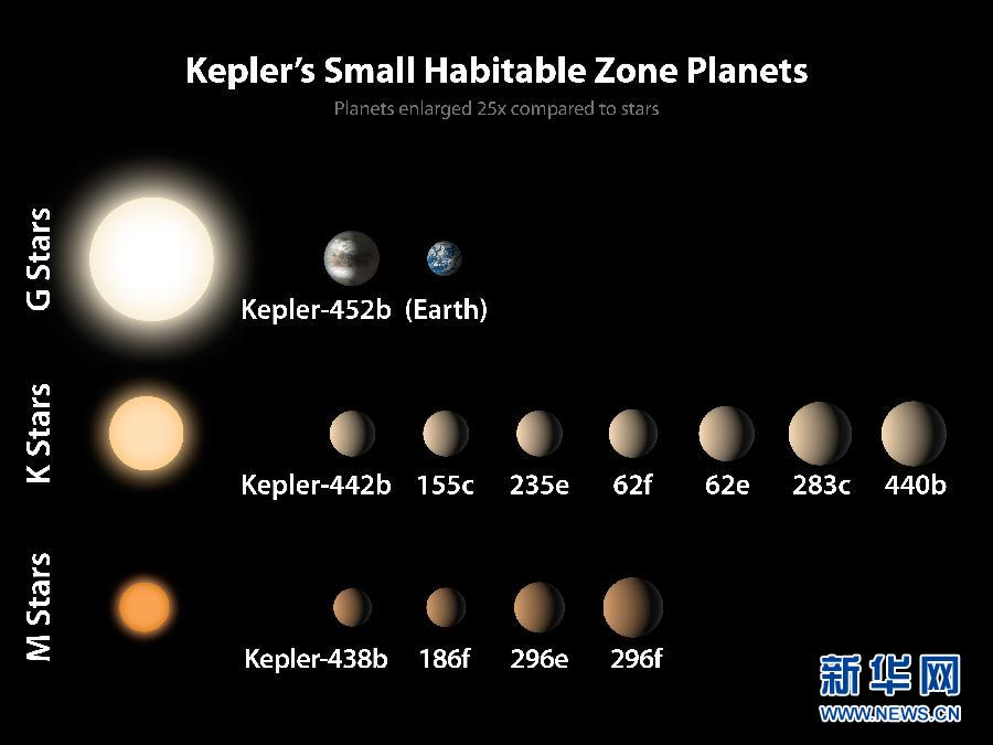 這張美國(guó)航天局7月23日公布的效果圖顯示的是新發(fā)現(xiàn)的12顆宜居帶行星,其中上右為地球,上左為太陽(yáng)系外行星開(kāi)普勒-452b。美國(guó)航天局23日在音頻新聞發(fā)布會(huì)上宣布,天文學(xué)家通過(guò)開(kāi)普勒太空望遠(yuǎn)鏡確認(rèn)在宜居帶發(fā)現(xiàn)第一顆與地球大小相似的太陽(yáng)系外行星開(kāi)普勒-452b。新華社發(fā)