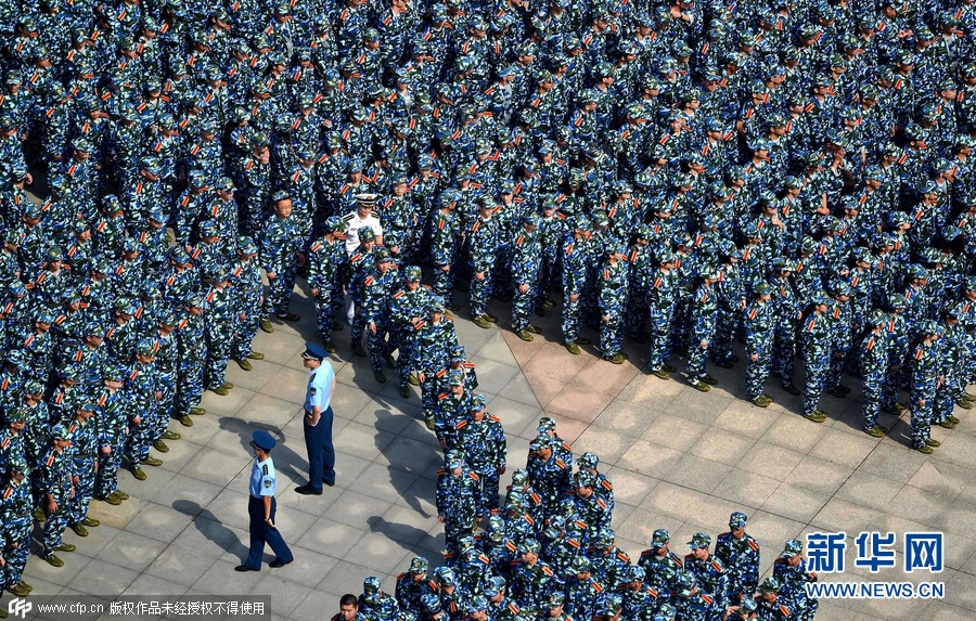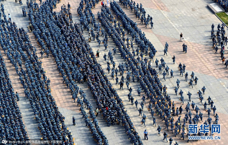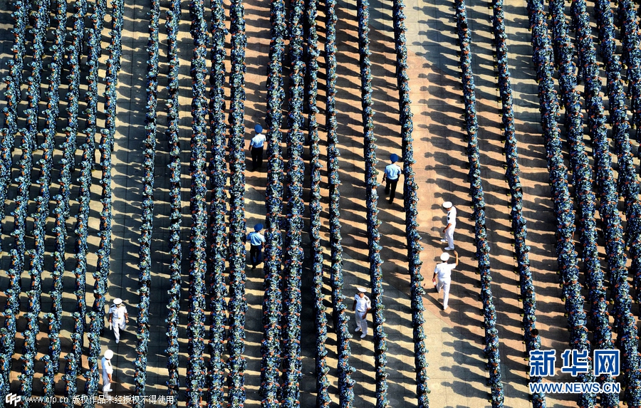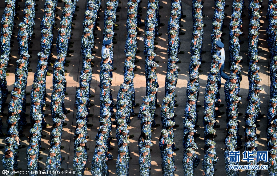 2015年9月14日,湖北武漢,當(dāng)日上午,武漢理工大學(xué)2015級(jí)本科生開學(xué)典禮暨軍訓(xùn)動(dòng)員大會(huì)在該校南湖校區(qū)舉行,全校多個(gè)校區(qū)約9000名新生身著迷彩戎裝一起進(jìn)行軍訓(xùn),場(chǎng)面震撼壯觀。南湖校區(qū)現(xiàn)場(chǎng)集合了約7000名新生參與軍訓(xùn),隊(duì)列整齊、英姿颯爽,熱情投入軍訓(xùn),開啟了朝氣蓬勃的大學(xué)新生活。圖片來源:cfp