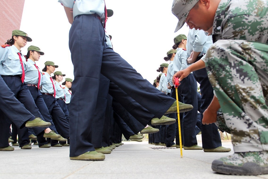 “以前上初中和高中都進(jìn)行過軍訓(xùn),但像這樣每一個(gè)動(dòng)作都有硬性指標(biāo)的還是第一次,難度確實(shí)大。頂著瓶子的時(shí)候,開始還好,后來稍不留神瓶子就容易掉下來?!币晃恍律f。圖為2015年9月17日,鄭州航院的“準(zhǔn)空姐”們正在軍訓(xùn),踢正步卷尺測量。