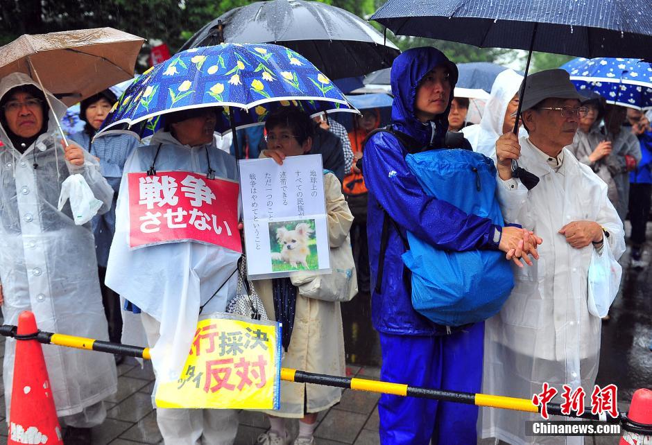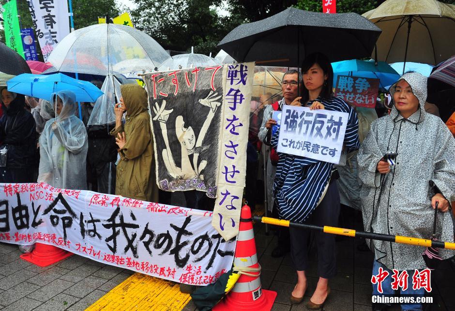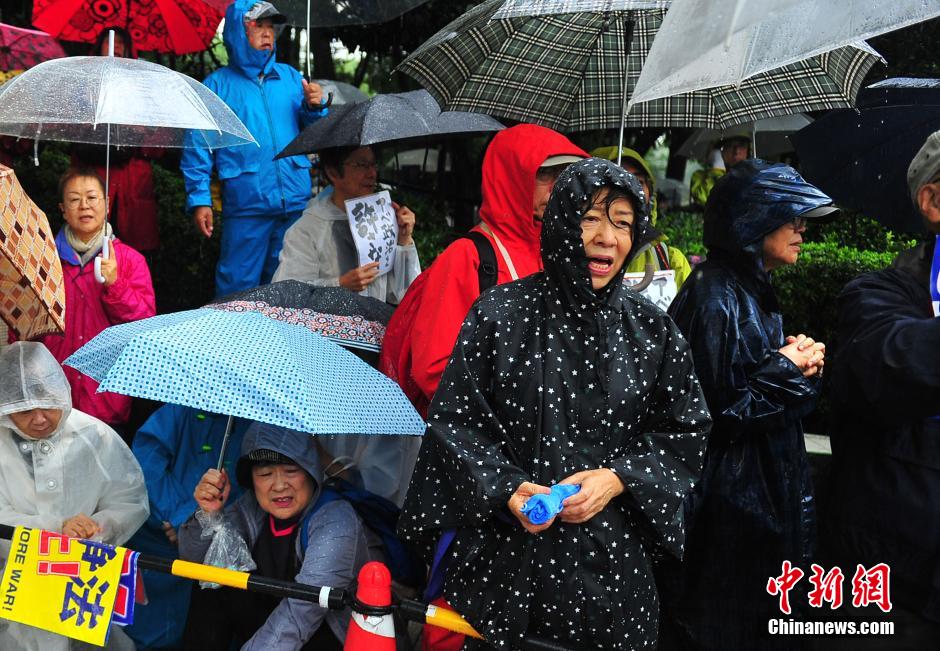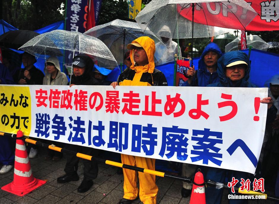 隨著安倍陣營強(qiáng)推以解禁集體自衛(wèi)權(quán)為核心內(nèi)容的安保法案最終過關(guān)的計(jì)劃進(jìn)入“倒計(jì)時”,日本民眾的反安??棺h活動再度進(jìn)入高潮。在之前徹夜抗議之后,9月17日白天,又有眾多日本民眾冒著大雨持續(xù)聚集在國會周邊進(jìn)行抗議活動。中新社發(fā) 王健 攝