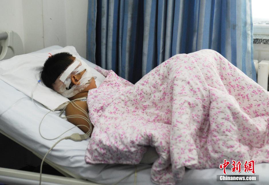 10月13日,12歲的朱某正在吉林大學(xué)第二醫(yī)院接受治療。據(jù)其家人介紹,10月11日,朱某獨自在家,遭同村村民王某挖出雙眼,行兇者還點燃了他家的房子,朱某靠裝死逃過一劫。王某事后自殺。目前雖經(jīng)手術(shù)治療,但朱某右眼視力已無恢復(fù)的可能,左眼亦不樂觀。警方正對此案進行調(diào)查。中新社記者 張瑤 攝