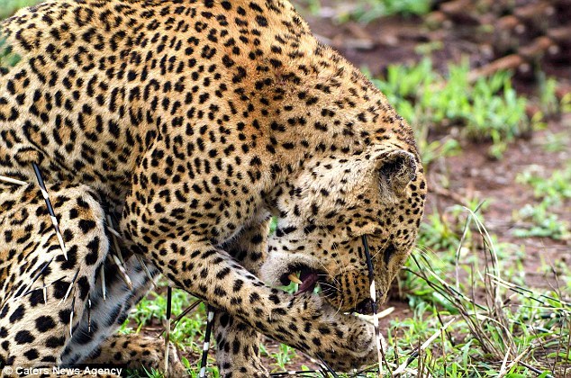 在與豪豬生死之斗后,豹子全身是傷。圖為豹子在舔舐傷口。