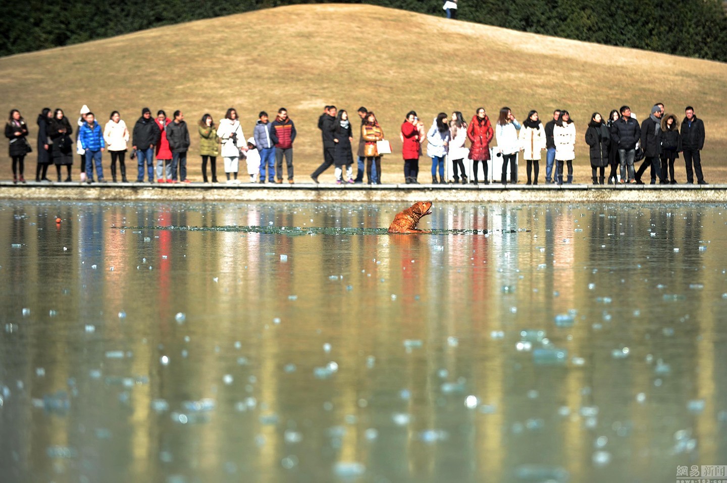 “狗狗主人一直告訴它要用力?!表?xiàng)先生說大金毛雖然奮力掙扎,卻無濟(jì)于事,越掙扎陷得越深,體力也消耗了不少。一旁的狗主人很是著急,決定下水救它,無奈女同志體力有限,基本破不了冰。不忍看著一個(gè)生命就這樣消失。圖為眾人圍觀被困冰窟的金毛。