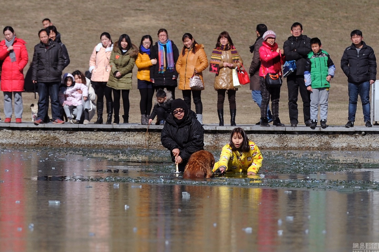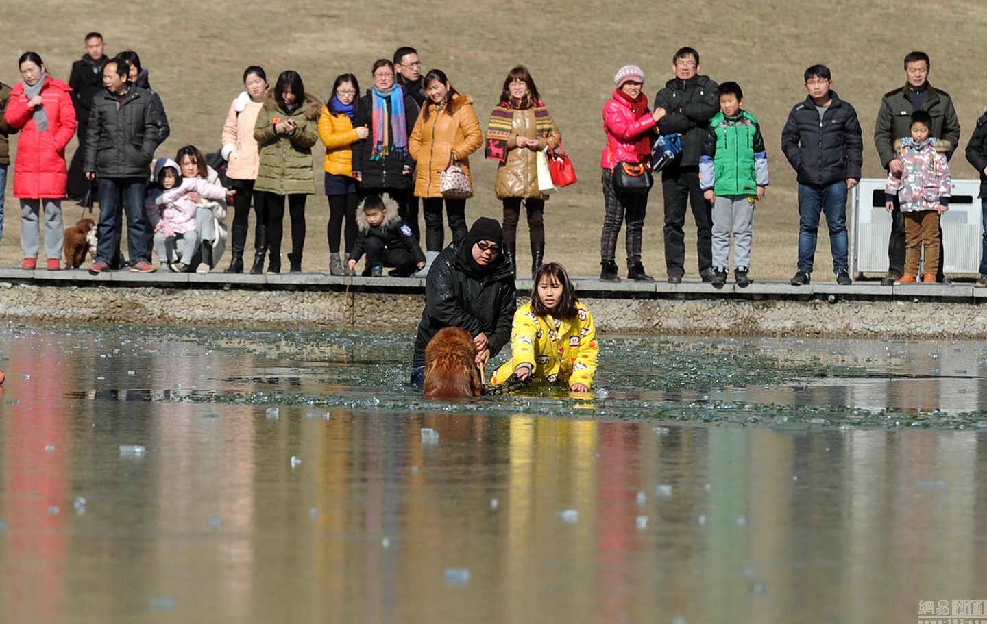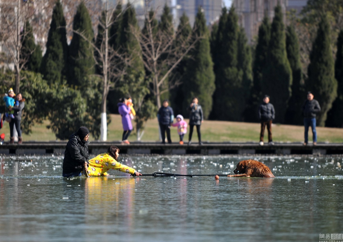 “我知道這水不深,自己又會(huì)游泳?!泵鎸?duì)冰冷的水面,項(xiàng)先生并沒有多想,只想趕緊救出狗狗。圖為兩人合力救金毛現(xiàn)場(chǎng)。
