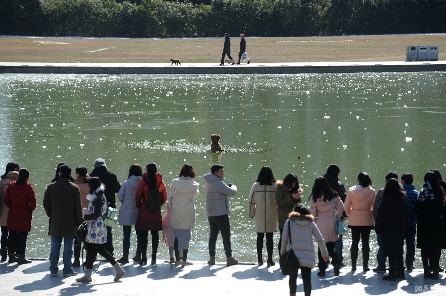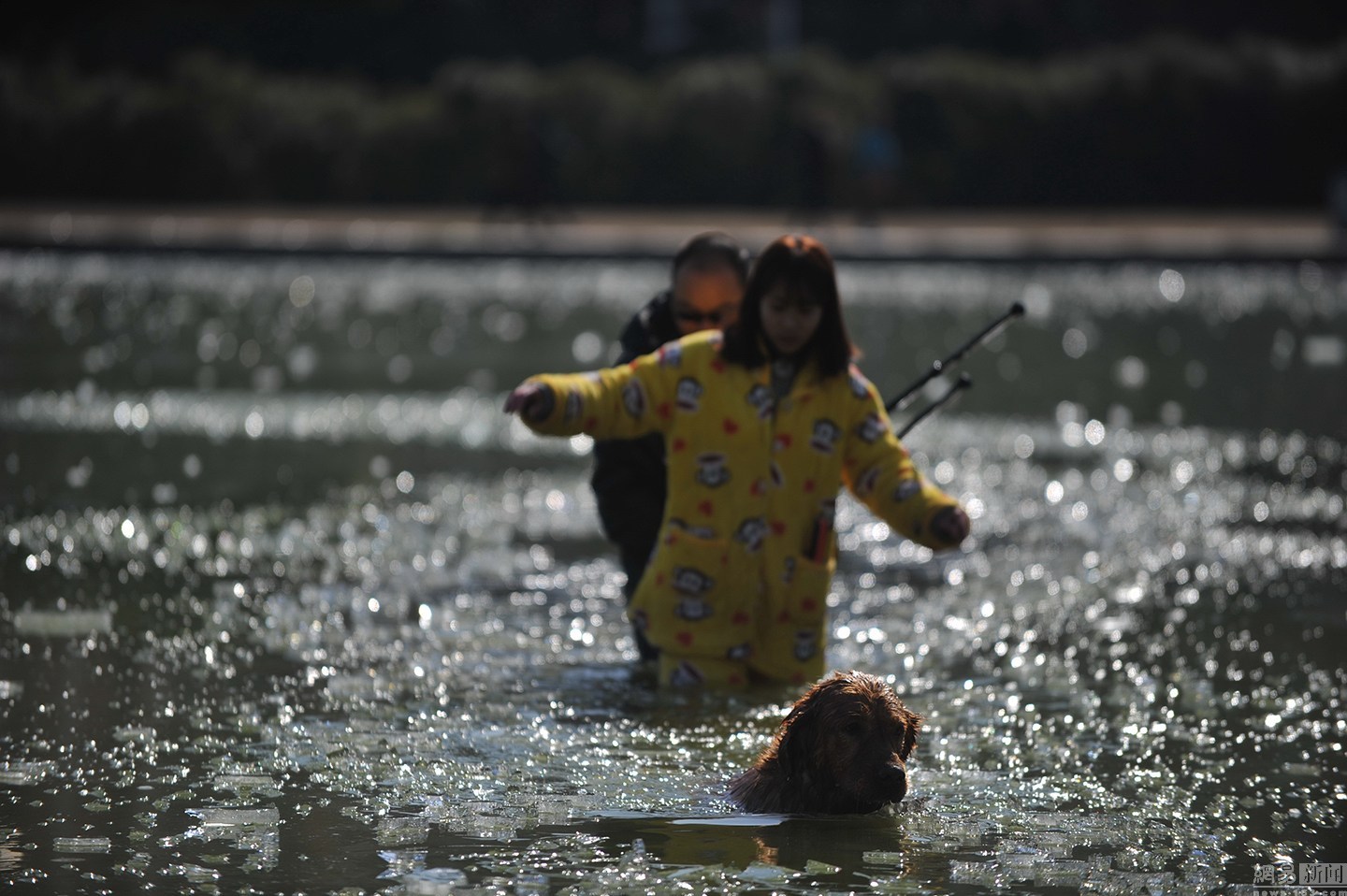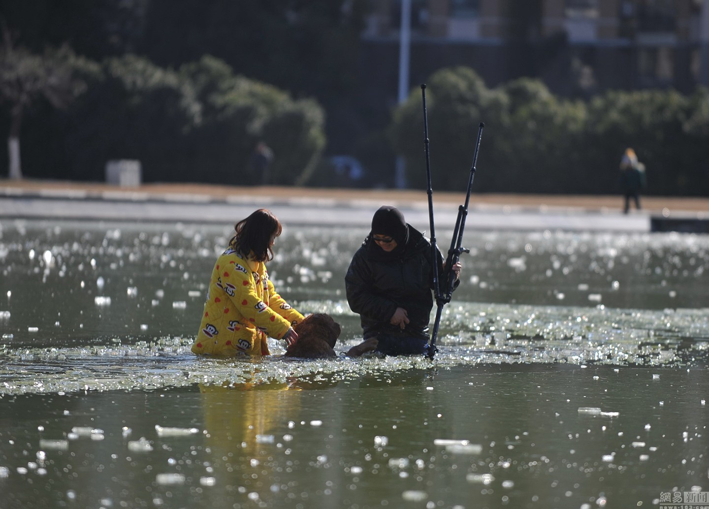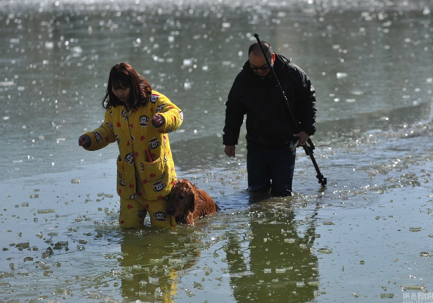 “我知道這水不深,自己又會(huì)游泳?!泵鎸?duì)冰冷的水面,項(xiàng)先生并沒有多想,只想趕緊救出狗狗。圖為兩人合力救金毛現(xiàn)場(chǎng)。