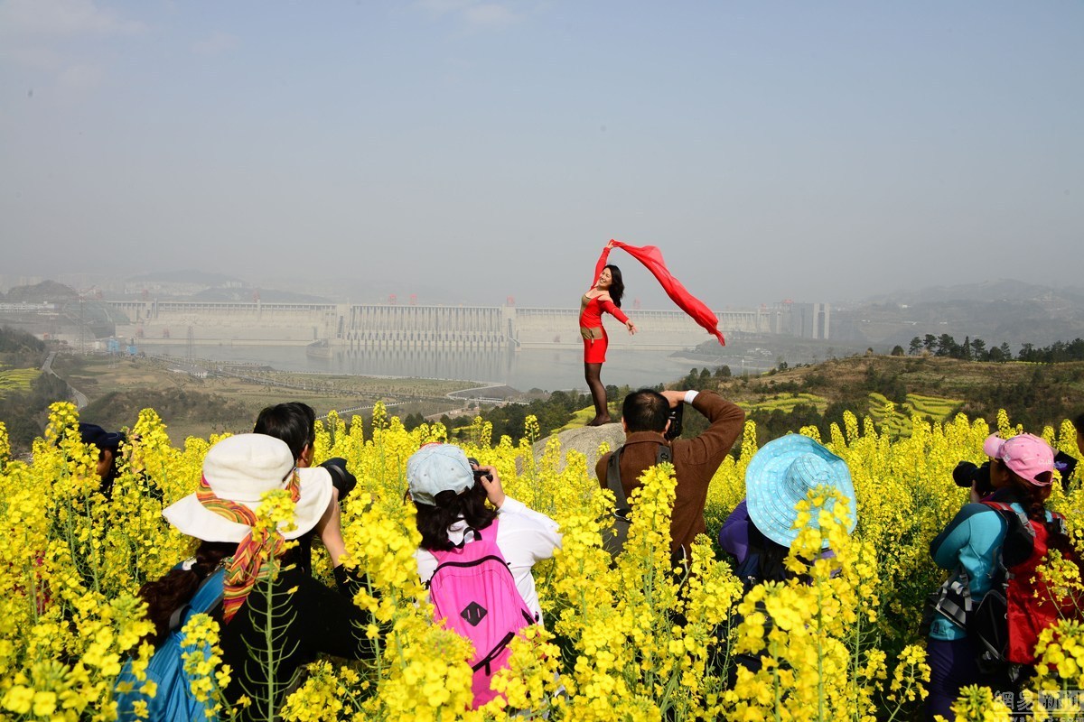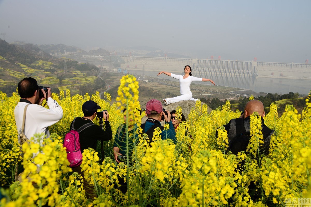 2016年3月6日,湖北宜昌,隨著春季氣溫的回升,湖北宜昌三峽壩區(qū)高家溪油菜花絢麗綻放,把三峽大壩映襯得分外壯觀美麗,吸引了眾多攝影發(fā)燒友和游人前來(lái)踏青采風(fēng)游覽。當(dāng)天一位練瑜伽的大媽陶醉于壩前花海,秀起了瑜伽,一時(shí)吸引了攝影發(fā)燒友和游人瘋狂拍攝。圖為大媽花海中秀瑜伽。