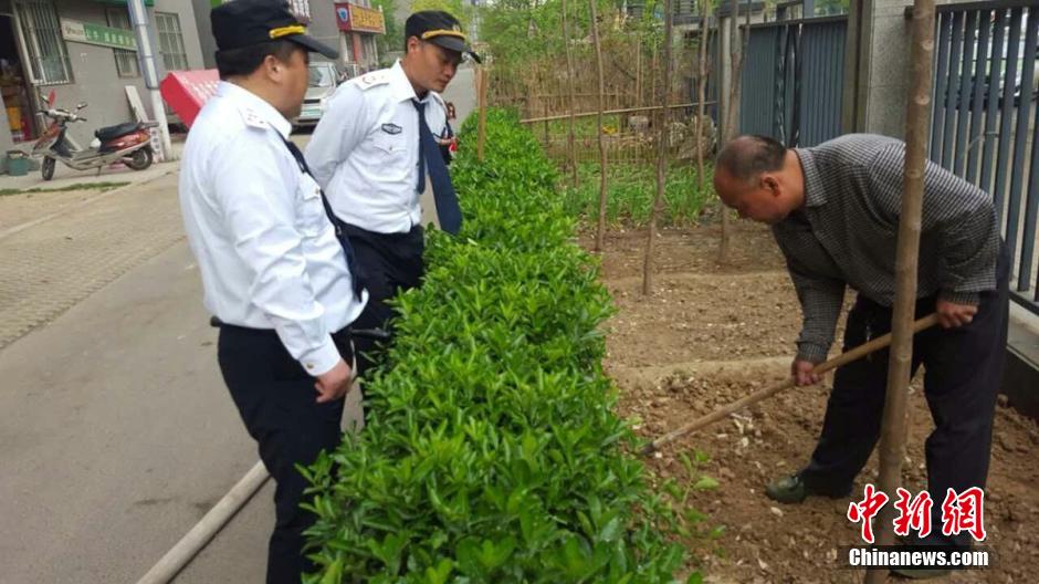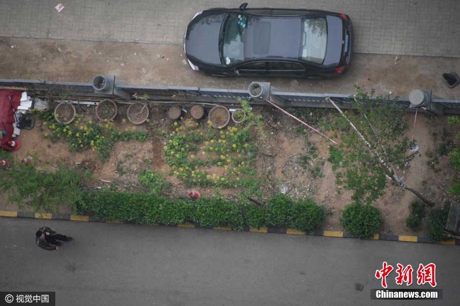 4月5日上午9時許,未來路街道巡防隊員司廣紅、盧龍等三人巡邏中發(fā)現(xiàn)一件奇葩事:有一根消防管從燕莊新區(qū)南院9號樓北面的20樓一家住戶窗口被放下,水管的另一頭直通小區(qū)柵欄里的小菜園。鄭州市燕莊村一村民住上了高樓,卻仍然放不下種地種菜。把小區(qū)垃圾清理出來,開墾出一片小菜園,又從20層的高樓往下放水澆菜。這種菜的成本遠高于買菜,但他卻樂在其中。李四信 攝 圖片來源:視覺中國