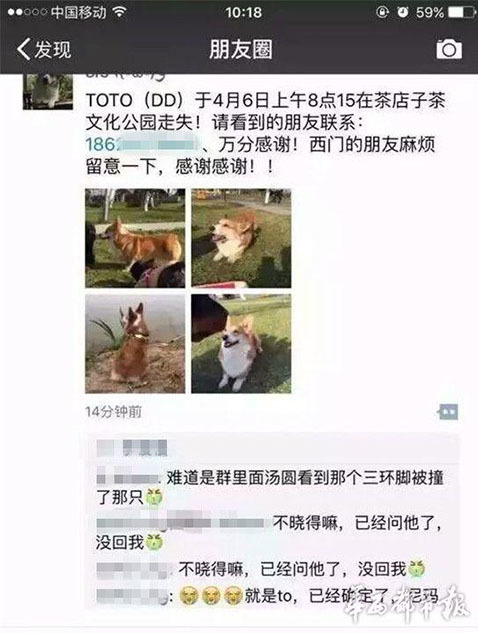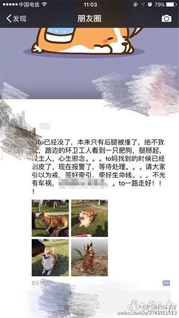 據(jù)主人李女士講述,“早上8點(diǎn)20分左右,我媽媽帶狗出去散步,它跟著別的狗跑丟了。我們找了很久。”李女士說(shuō),小狗跑丟后,在成都一愛(ài)寵微信群里,有群友稱在三環(huán)路上看到過(guò)它,“說(shuō)是它橫穿三環(huán)路,把后腿撞到了,它就沿著三環(huán)路跑了?!眻D為李女士在朋友圈發(fā)布的尋狗信息。
