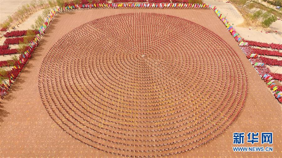 4月7日,在河南登封少林塔溝武術(shù)學(xué)校練功場,上課間操的學(xué)員擺出圓形圖案。當(dāng)日,河南登封少林塔溝武術(shù)學(xué)校2016年“春訓(xùn)”拉開帷幕,2.6萬名學(xué)員同上陣,進(jìn)行隊(duì)形變換、十八般兵器、少林硬氣功、少林集體棍等多種功法演練。“春訓(xùn)”是少林塔溝武術(shù)學(xué)校每年春季開展的一項(xiàng)強(qiáng)化訓(xùn)練活動,旨在提升學(xué)員的耐力和競技狀態(tài)。新華社發(fā)(牛書培 攝)