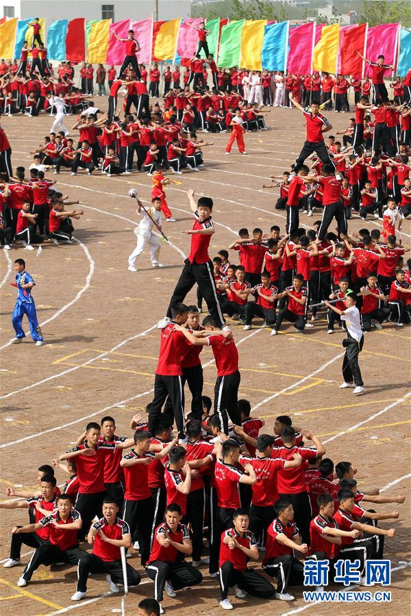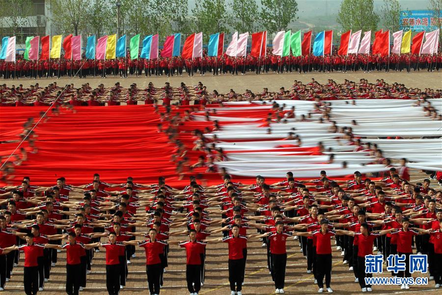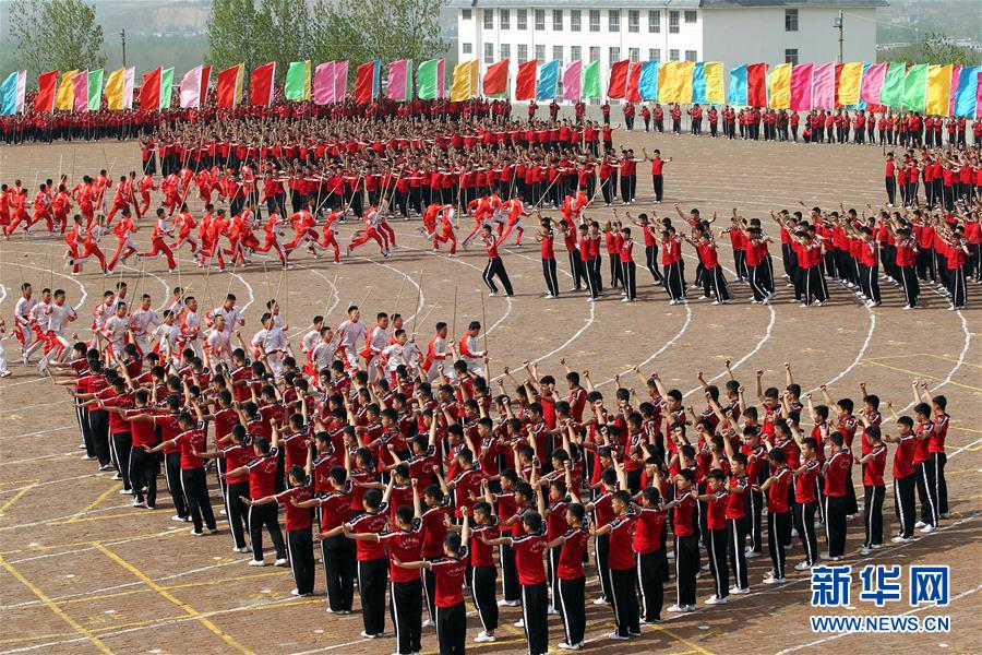 4月7日,在河南登封少林塔溝武術(shù)學(xué)校練功場,上課間操的學(xué)員進(jìn)行隊(duì)形變換。當(dāng)日,河南登封少林塔溝武術(shù)學(xué)校2016年“春訓(xùn)”拉開帷幕,2.6萬名學(xué)員同上陣,進(jìn)行隊(duì)形變換、十八般兵器、少林硬氣功、少林集體棍等多種功法演練?!按河?xùn)”是少林塔溝武術(shù)學(xué)校每年春季開展的一項(xiàng)強(qiáng)化訓(xùn)練活動,旨在提升學(xué)員的耐力和競技狀態(tài)。新華社發(fā)(牛書培 攝)
