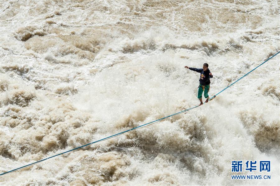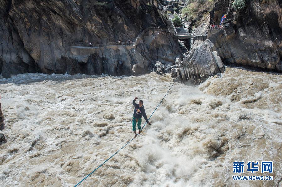 4月26日,張亮在扁帶上行走。當(dāng)日,在云南香格里拉的長江天險虎跳峽上,“中國扁帶第一人”張亮利用寬度只有2.5厘米的扁帶,在距離江面16米的高度上成功行走60米,耗時5分58秒抵達(dá)虎跳峽香格里拉一側(cè)的終點(diǎn)完成挑戰(zhàn)。