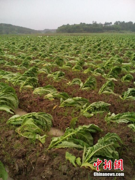 5月4日至5日,地處湘南的永州市道縣遭遇龍卷風(fēng)和暴風(fēng)雨襲擊,部分鄉(xiāng)鎮(zhèn)的樹木被大風(fēng)攔腰折斷或連根拔起,46個行政村電力中斷,當(dāng)季農(nóng)作物特別是烤煙大面積受災(zāi)。目前,該縣已迅速組織2000余名各級干部,深入災(zāi)區(qū)組織搶險救災(zāi)。圖為龍卷風(fēng)過后烤煙大面積倒伏。 道縣宣傳部 供圖