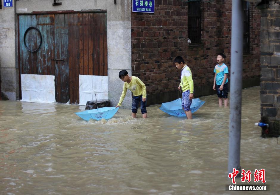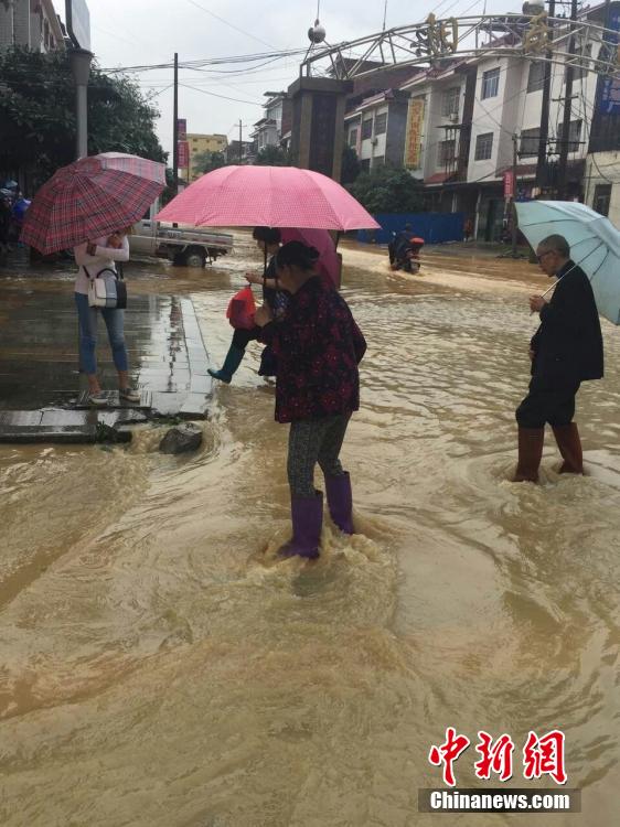 5月5日,地處湘南的永州市道縣遭遇暴風(fēng)雨襲擊,縣城內(nèi)多處低洼路段被水淹沒。當(dāng)?shù)胤姥床块T正嚴(yán)密監(jiān)控雨情、水情,確保安全度汛。圖為市民趟水出行。 中新社發(fā) 何紅福 攝