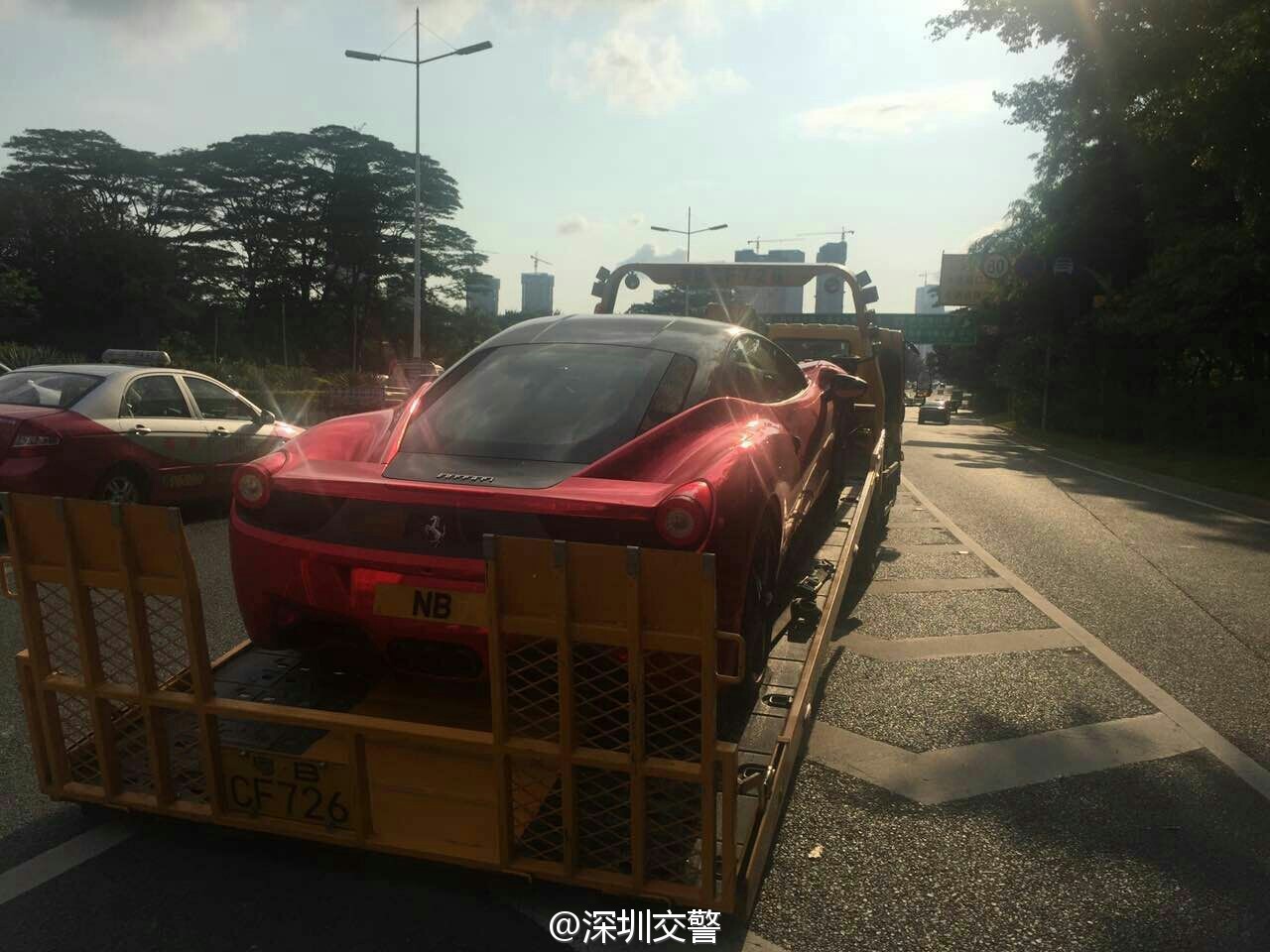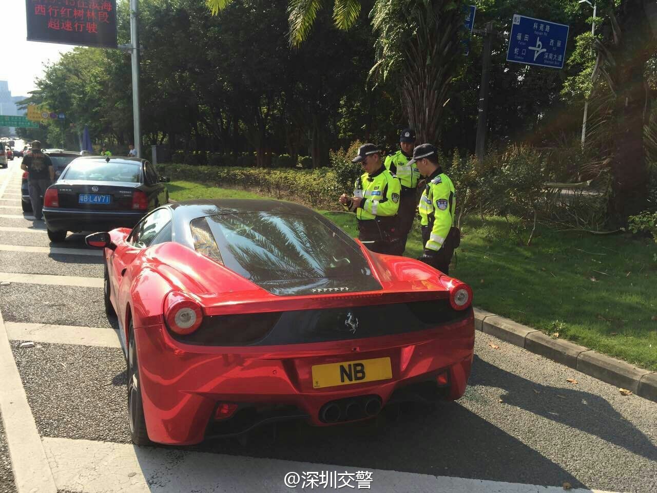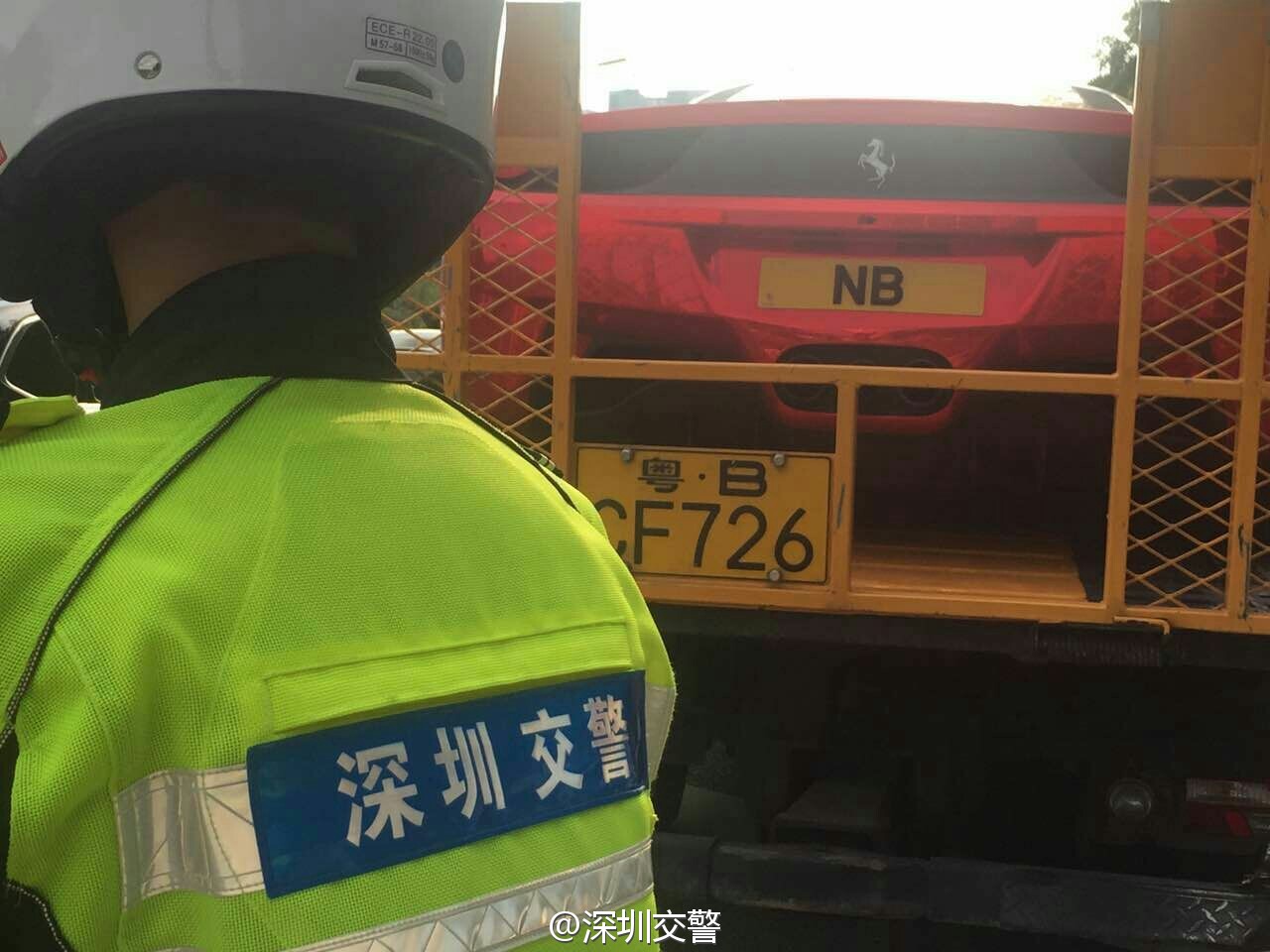 深圳交警5月7日17:16發(fā)布了一條微博:“當鐵騎遇到他……”,同時配上四張圖片:只見一輛掛著“NB”車牌的紅色跑車被交警鐵騎攔下,最后被帶走。