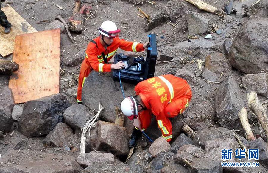 5月8日,在福建泰寧山體滑坡救援現(xiàn)場,武警水電二總隊六支隊官兵利用“雷達生命探測儀”對任務區(qū)進行搜救(手機拍攝)。