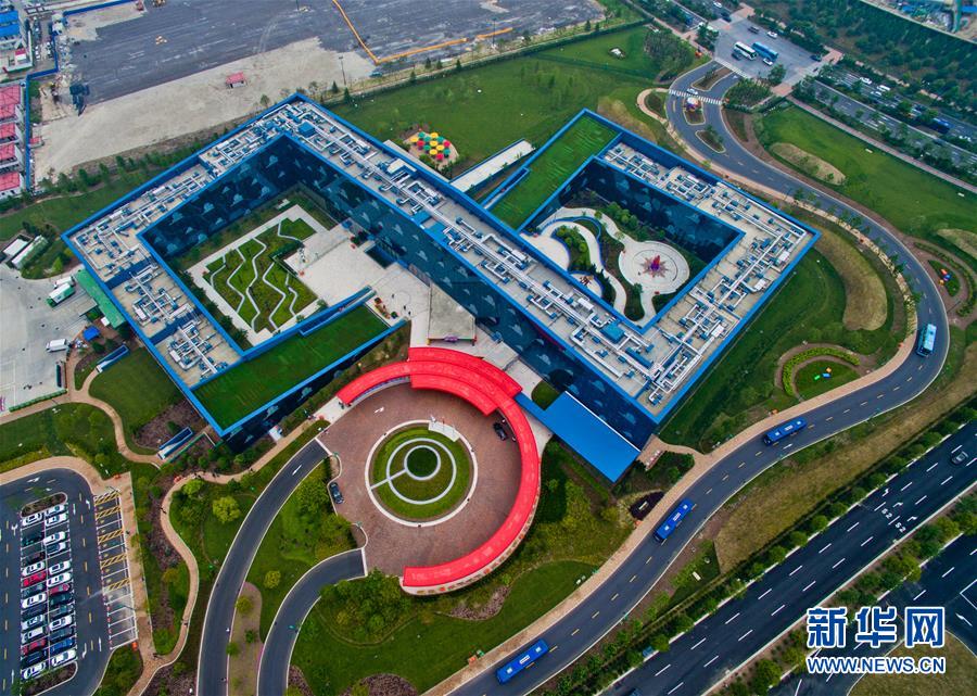 5月15日從空中俯瞰上海迪士尼玩具總動員酒店。當日,上海迪士尼主題酒店之——玩具總動員酒店大堂、廣場、餐廳、度假區(qū)短駁車等區(qū)域及設施開始內部測試。這家共有800個房間的主題酒店將于6月中旬正式迎客。新華社發(fā)(鈕一新 攝)