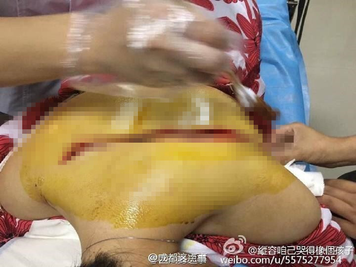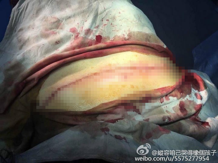 在醫(yī)院治療時,有人幫她拍下一組照片。其中一張,該年輕女子趴在手術(shù)臺,可明顯看到其后頸下方15厘米處,有一條從左手腋窩延生至右肩的傷口,醫(yī)生正對其進(jìn)行手術(shù)。而另一張圖片,是其傷口縫合后情況,背部有一條如蜈蚣般的傷痕,令人觸目驚心。
