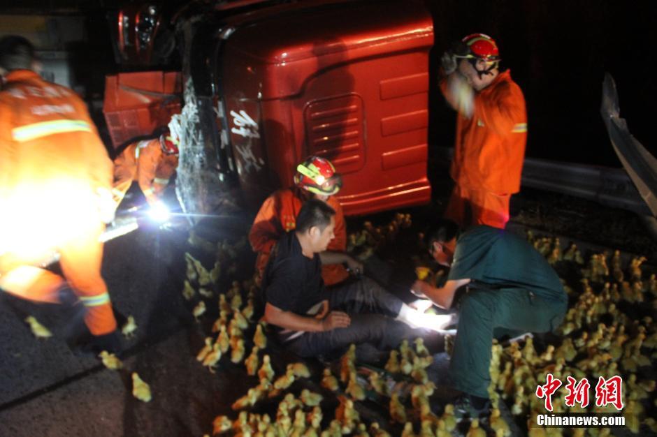 7月26日凌晨,在京臺高速滕北出口往南路段發(fā)生一起車禍,一輛裝滿鴨苗的廂貨車與半掛車發(fā)生追尾,車上3人被困,數(shù)千只鴨苗散落在高速路上。山東省棗莊市滕州消防大隊接到報警后迅速出動,對高速路面上的鴨苗進行了驅(qū)趕,疏通高速交通,及時營救出車上被困人員。中新社發(fā) 季龍 攝 圖片來源:CNSPHOTO