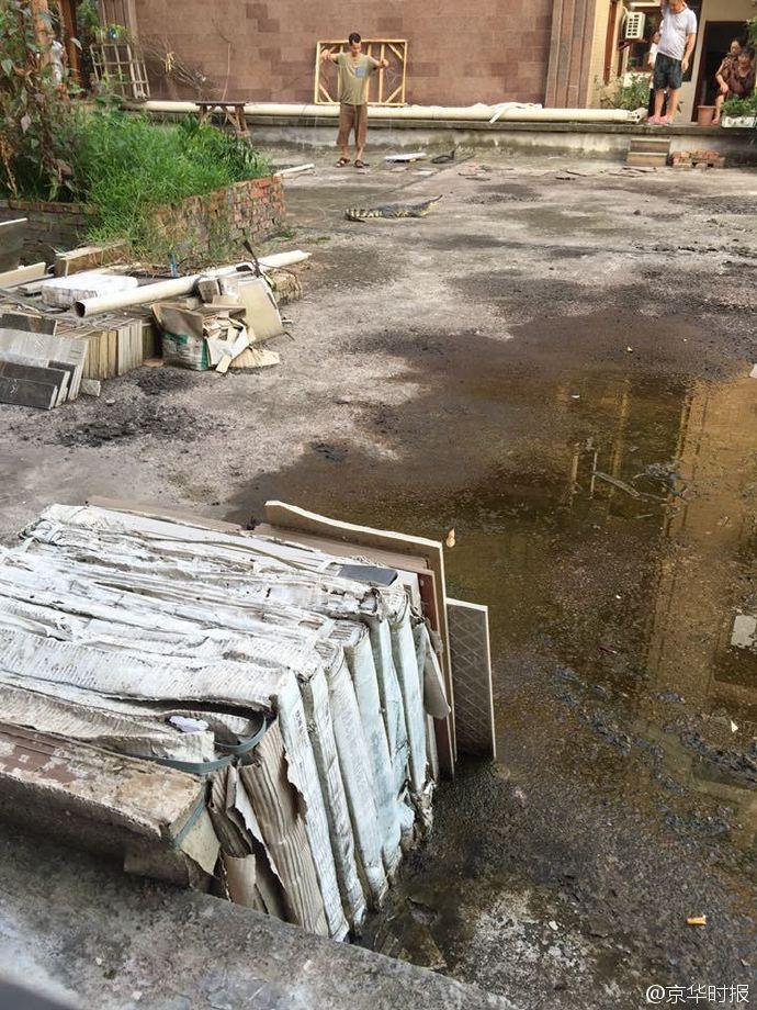 21日,四川省自貢市范女士告訴記者,昨晚樓上鄰居家的鱷魚“跳樓”了,掉進她家一樓的小花園里。