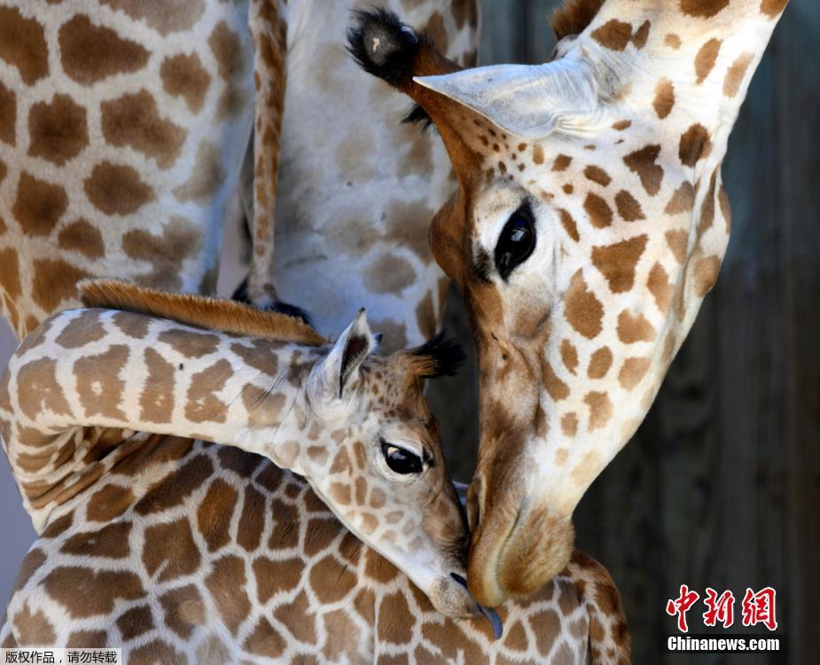 近日,法國 La Fleche,12歲的南非長頸鹿Dioni誕下可愛寶寶Kenai。攝影師記錄了出生才幾天的小長頸鹿和媽媽的親昵瞬間。圖為Kenai正在親吻母親。