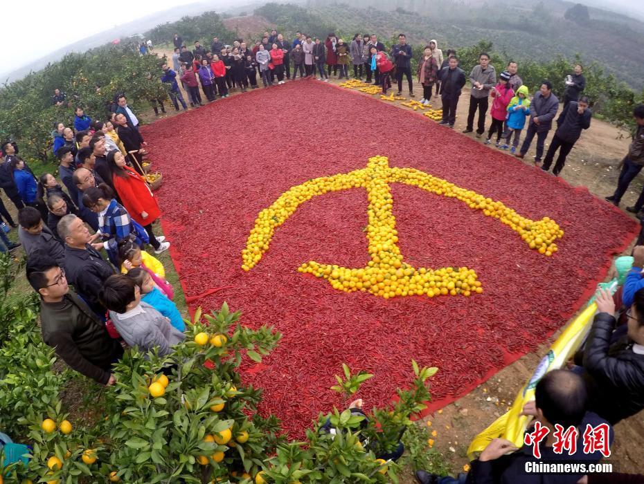 11月6日,南水北調(diào)中線工程水源地——河南淅川丹江大觀苑,滿園的桔子喜獲豐收,枝頭上碩果累累,多位農(nóng)民在桔子地里用豐收的金黃桔子和當(dāng)?shù)氐奶禺a(chǎn)紅辣椒拼成鮮艷奪目的巨幅黨旗。一位農(nóng)民告訴記者,為了拼這幅圖案,他們十幾個人整整用了兩天時間。吳揚 攝