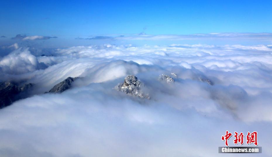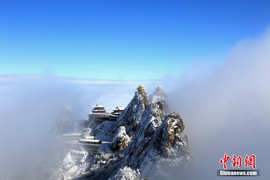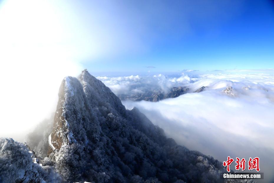 1月7日,連續(xù)降雪之后,位于河南洛陽(yáng)的道教圣地老君山雪后初晴,海拔2000米的伏牛山主峰上,白雪皚皚、銀裝素裹,加之云海浮現(xiàn)與藍(lán)天白云交相輝映,絕壁道觀似瓊樓玉宇幻如仙境美不勝收。圖為云海波濤洶涌,“淹沒(méi)”山頂。王中舉 攝