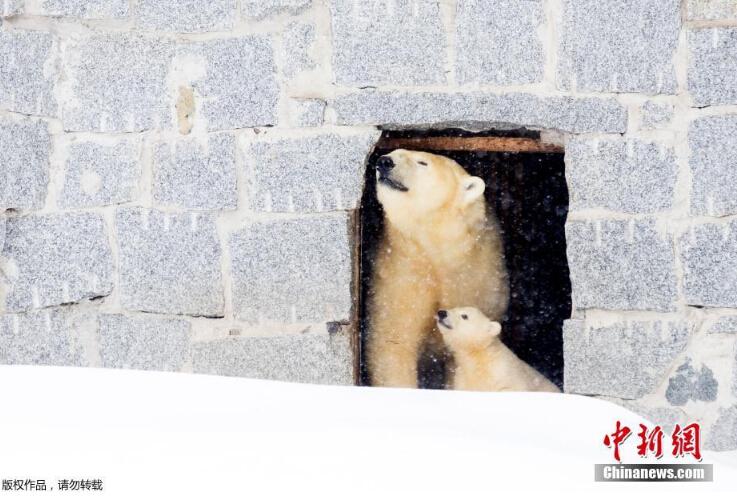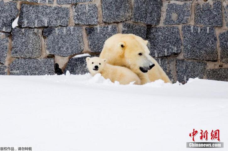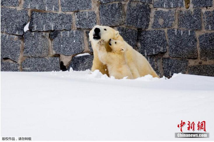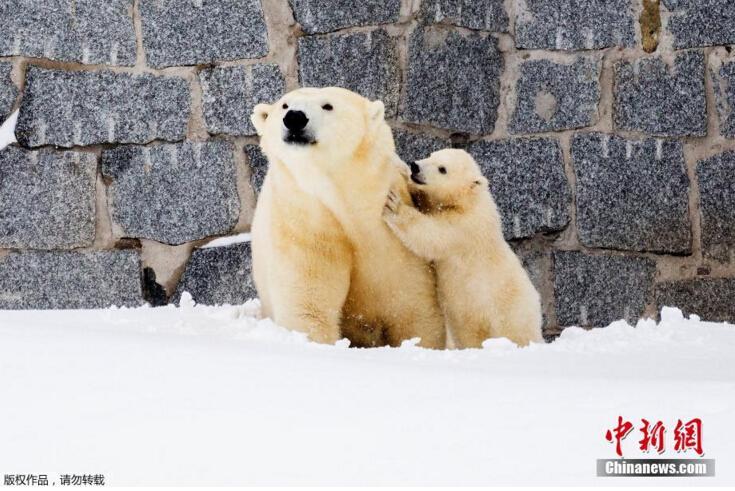 當(dāng)?shù)貢r(shí)間3月15日,芬蘭一野生動(dòng)物園內(nèi),北極熊母親帶著她的幼崽第一次在戶外亮相。小北極熊第一次在雪中玩耍,跟母親“求抱抱”。