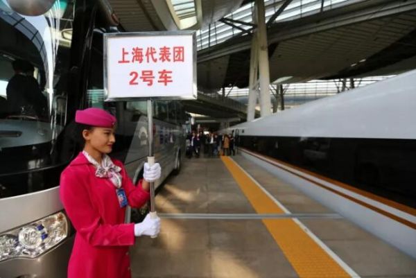 ▲2017年10月16日,上海市十九大代表乘坐“復(fù)興號(hào)”高鐵列車抵達(dá)北京南站。